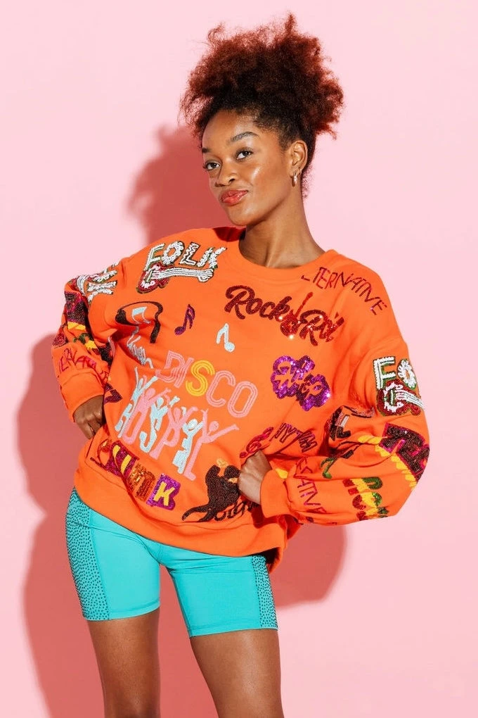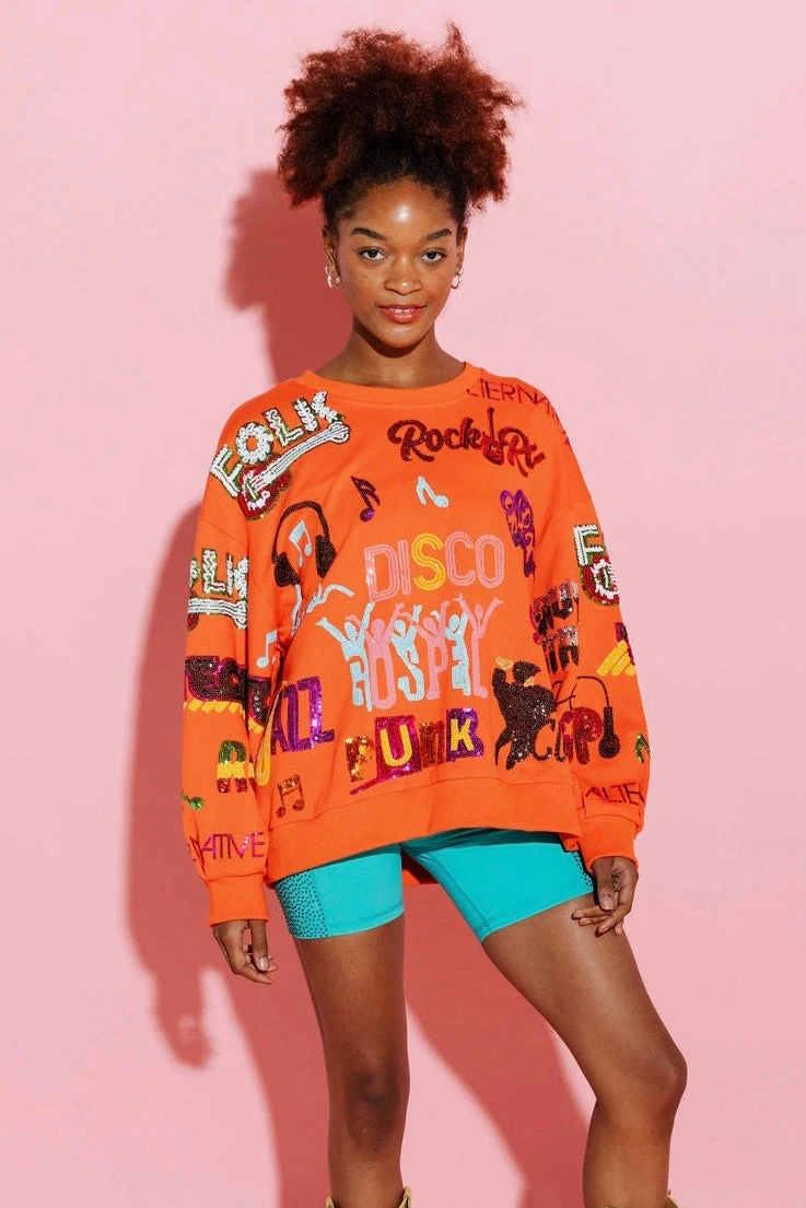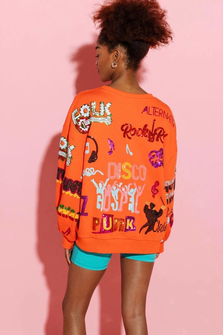 This music-themed sweatshirt features oversized sequins, showcasing a variety of musical genres, from rock and roll to alternative, disco, and classic.