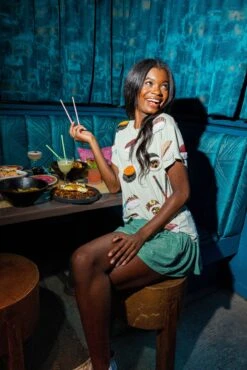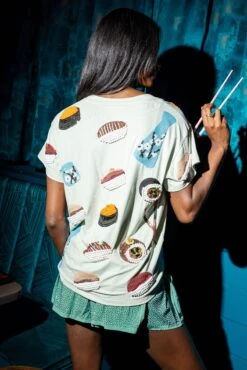 Note: Due to manufacturing issues, the pale green tee was produced without white and orange beading on “sushi” images. We do apologize for this minor detail mishap.