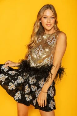 Queen Of Sparkles Gold & Black Sequin Fleur De Lis Feather Tank