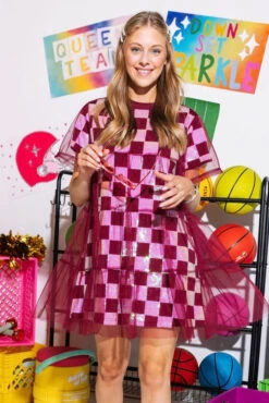 Queen Of Sparkles Maroon& White Checkered Mesh Overlay Tee Dress