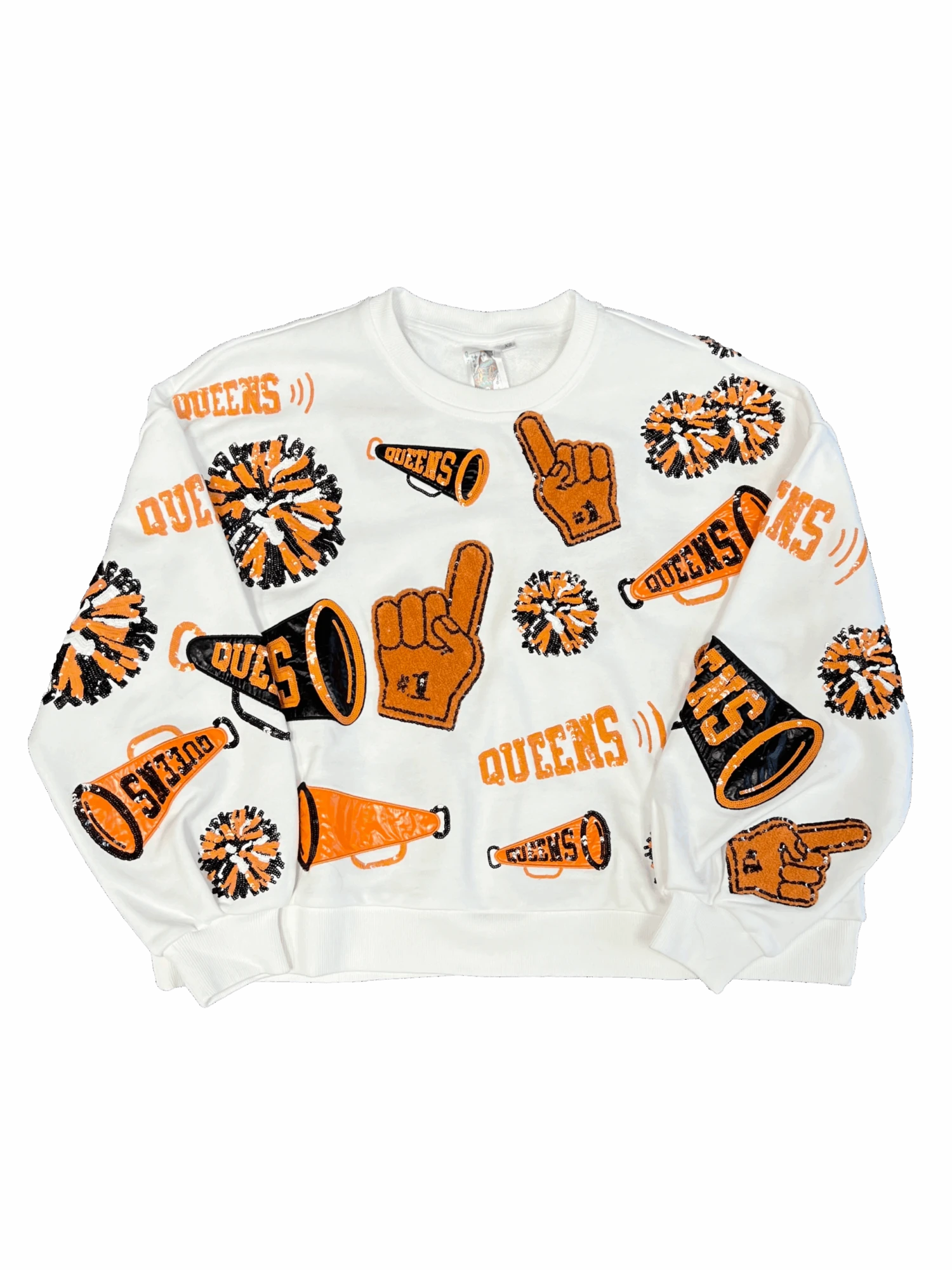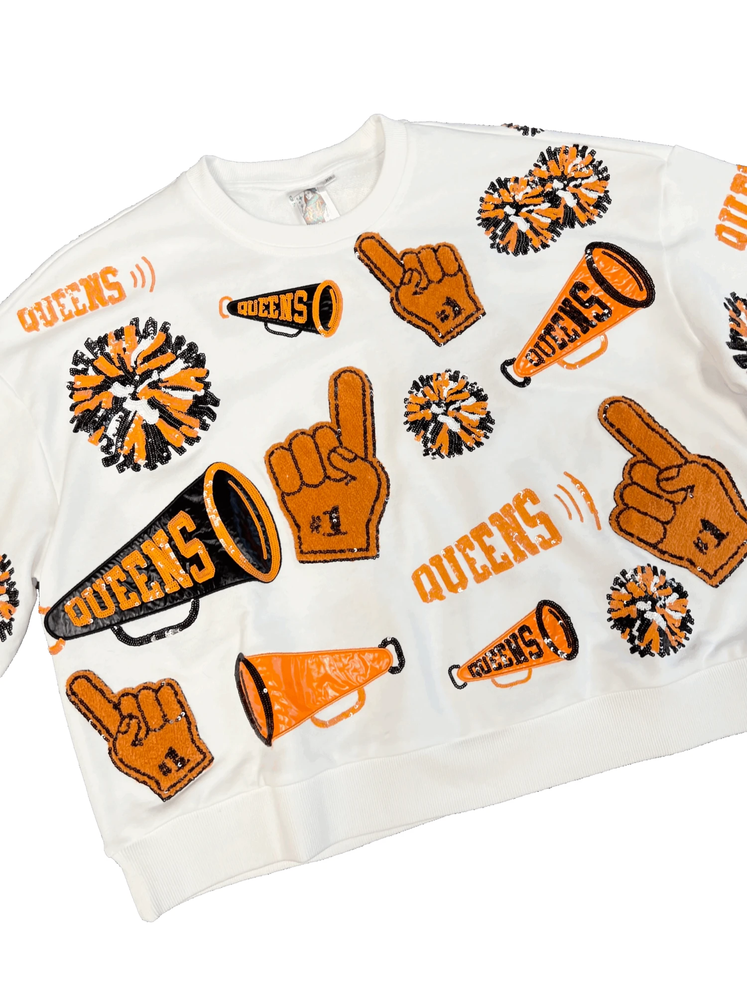This Orange & Black Cheers Queen Icon Sweatshirt is a must-have in any gameday enthusiast’s wardrobe. It features an oversized fit for extra comfort and comes with a variety of iconic cheers motifs such as megaphone, foam finger, and pom pom. Enjoy the perfect combination of style and comfort!