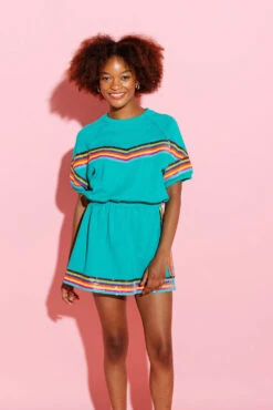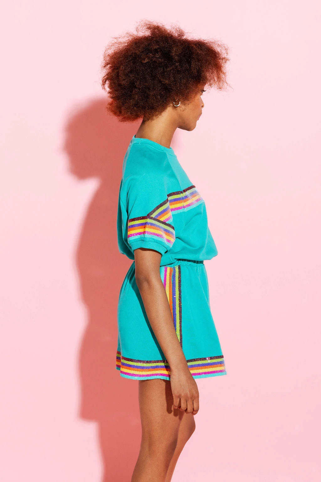 This Teal Rainbow Sequin Stripe Dress features a relaxed fit with a synched waist, made of a soft and cozy sweatshirt material.