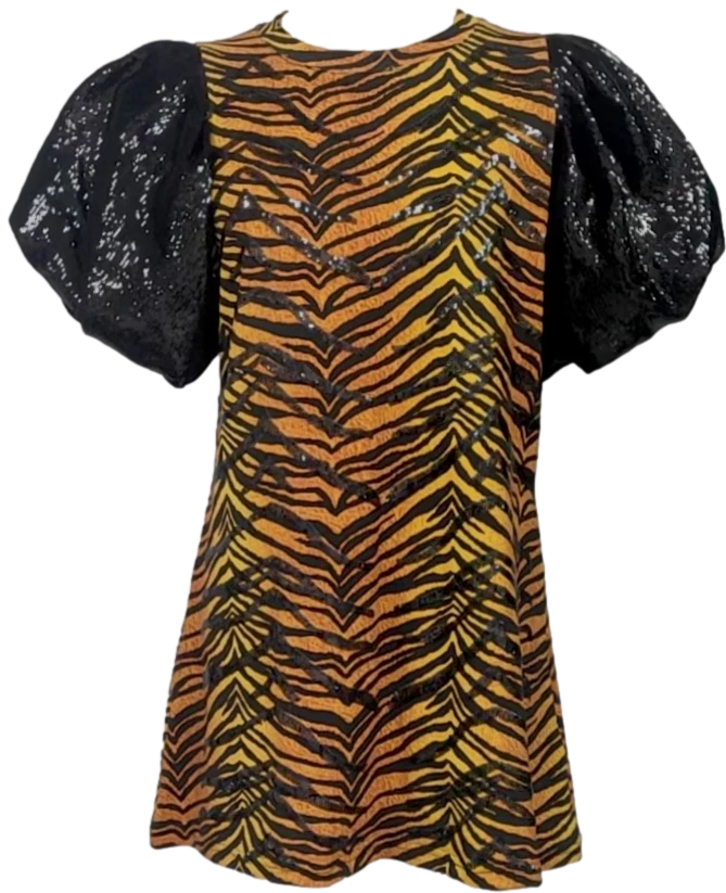 Queen Of Sparkles Tiger Print Poof Sequin Sleeve Dress